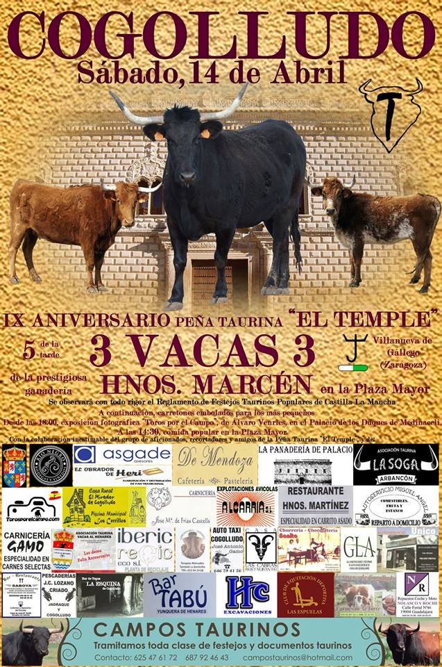 El próximo sábado 14 de abril, en la plaza Mayor de Cogolludo, tendrá lugar la Ssuelta de tres espectaculares vacas, de la prestigiosa ganadería de Hnos. Marcén, de Villanueva de Gallego (Zaragoza), con motivo de la celebración del IX Aniversario de la Asociación Taurina "El Temple" de Cogolludo.