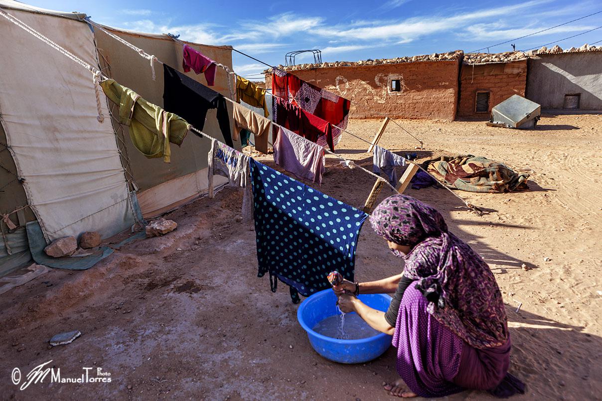 A continuación, agrupadas por temas, los ocres de la arena del desierto se mezclan, en las escenas elegidas, con explosiones de color “y de vida en pleno desierto”, según explica el autor. En ellas se aprecia la observación diaria de la realidad saharaui, con ojos de fotógrafo. Con el título de la exposición, Torres subraya lo que cuenta su trabajo gráfico: “son las mujeres quienes llevan el peso de la resistencia y de las conquistas sociales, allí en el Sahara, y en el mundo”.