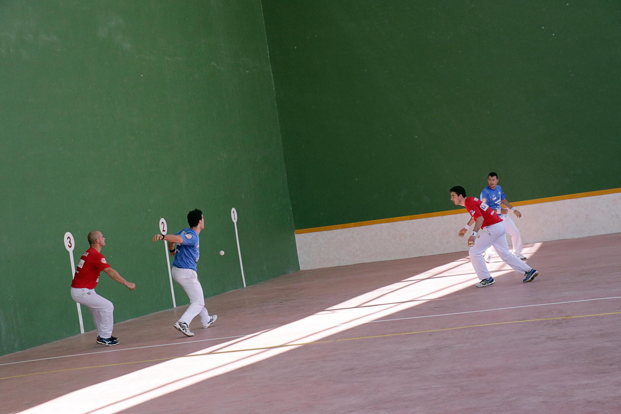 El primer partido, mano a mano, disputado en la modalidad de cuatro y medio, enfrentó a Pocholo (azul) y a Serrano (rojo), ambos pertenecientes al club de pelota a mano de El Molar (Madrid), si bien Serrano es oriundo de la localidad alcarreña de Escamilla.