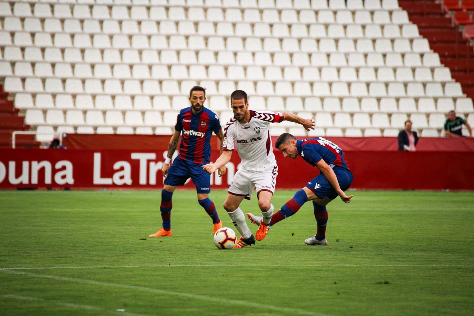 LEVANTE UD: 13. Oier; 4. Robert Pier, 5. Doukoure, 24. Campaña, 22, A. Luna, 19. Pedro López, 15. Postigo, 23. Jason, 10. Morales, 11. Bardhi, 9. Roger