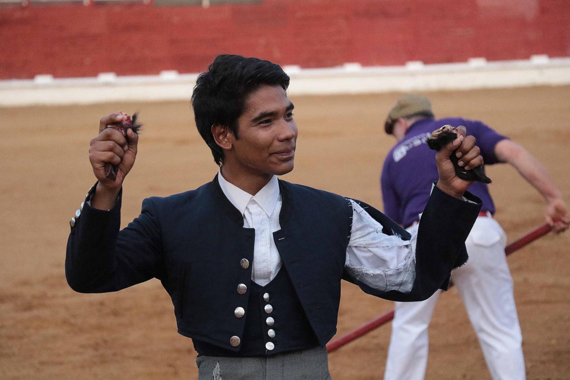Leandro Gutiérrez, alumno del CITAR de Guadalajara, fue el gran triunfador de la tarde. “Quiero llegar a lo más alto”, decía antes de vestirse, algo que demostró en la arena. Le hizo una faena extraordinaria a un novillo complicadísimo, de esos que no quieren saber nada dela lidia. Por el pitón izquierdo no tenía un pase. Pero, Gutiérrez, con la mano derecha, le hizo embestir. Estuvo fantástico con un toro con mucho genio, con muchas dificultades, en una faena con emoción. VER UN MOMENTO DE LA FAENA. “El novillo se colaba por ambos pitones, pero al final, por el derecho, se ha entregado y lo he sometido. Me quedo con el conjunto de la faena, con las ganas que le he puesto”, decía orgulloso el chaval. El colombiano sabía que tenía el triunfo en su mano, y no se lo dejó escapar con la espada. “Ser torero es lo que más me gusta, mi pasión desde los doce años”. VER LEANDRO GUTIERREZ.