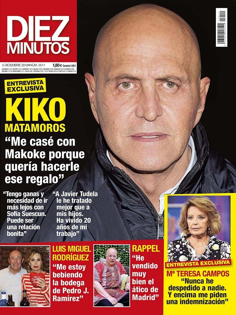 Kiko Matamoros inunda la portada de Diez Minutos con motivo de una entrevista exclusiva en la que confiesa que se casó con Makoke porque quería hacerle ese regalo. Con respecto a su relación son Sofía Suescun asegura: “Tengo ganas y necesidad de ir más lejos con Sofía Suescun. Puede ser una relación bonita”. También habla de Javier Tudela: “A Javier Tudela le he tratado mejor que a mis hijos. Ha vivido 20 años de mi trabajo”.