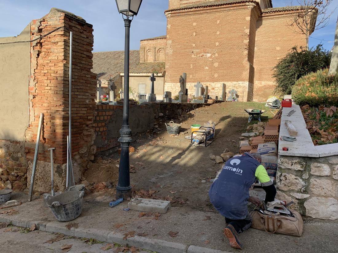 Por otro lado, en estos días están en marcha unas obras para la reparación de uno de los muros del cementerio, así como de la escalera que da acceso a la cuesta de San Vicente desde la Plaza del Ayuntamiento. El fin de estas obras es el de eliminar el riesgo de caída en la cuesta, mediante la instalación de vallas y eliminar el muro, retranqueándolo unos metros, de manera que queda abierta la posibilidad de ampliar el cementerio, que ahora es de titularidad parroquial, también a un espacio nuevo, de titularidad municipal.