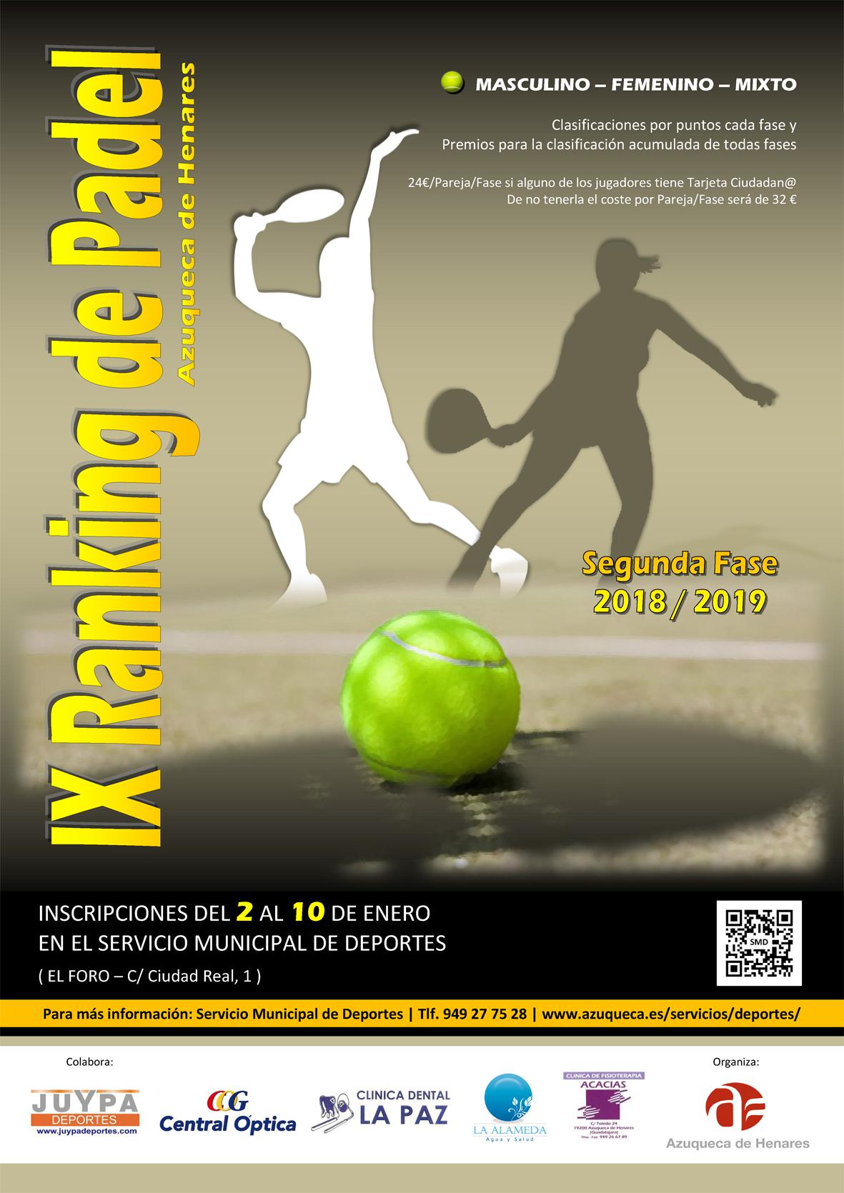 Desde este miércoles 2 y hasta el 10 de enero, el Ayuntamiento de Azuqueca de Henares mantiene abierta la inscripción en la segunda fase del Ranking de Pádel. Esta competición municipal cuenta con tres categorías -Masculina, Femenina y Mixta- y se juega en las pistas ubicadas en el complejo San Miguel y la zona deportiva Arroyo del Vallejo.
