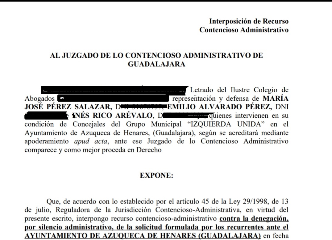 Los ediles del grupo municipal de IU, María José Pérez Salazar, Emilio Alvarado Pérez e Inés Rico Arévalo interpusieron recurso contencioso el pasado 18 de enero contra el Ayuntamiento de Azuqueca de Henares.