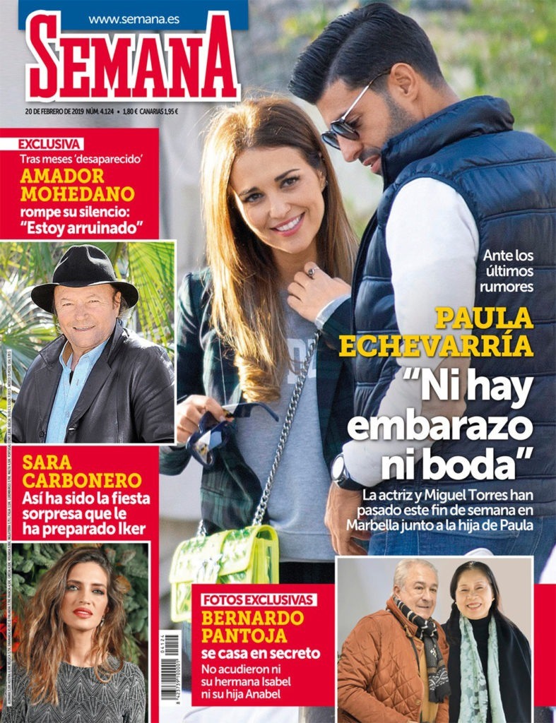 Paula Echevarría y su novio Miguel Torres protagonizan la portada de Semana. La pareja disfrutó de un fin de semana en Marbella junto a la hija de Paula. Ante los últimos rumores, la actriz niega tajante que esté embarazada de su primer hijo junto al futbolista y que vaya a haber boda. “Ni hay embarazo ni boda”, asegura.