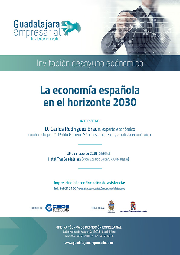 El próximo 19 de marzo va a desarrollarse el primer desayuno económico que llevará por título “La economía española en el horizonte 2030” y que contará con la presencia del experto económico Carlos Rodríguez Braun y el moderador Pablo Gimeno, analista económico. Este primer desayuno, que tendrá lugar en el Hotel Tryp de Guadalajara a las 9:30 horas, supone el pistoletazo de salida del ciclo de desayunos empresariales y encuentros que se realizarán a lo largo de este 2019, enmarcados dentro del proyecto “Guadalajara Empresarial”. Una iniciativa promovida por CEOE-CEPYME Guadalajara, en colaboración con la Diputación provincial y el Ayuntamiento de Guadalajara.