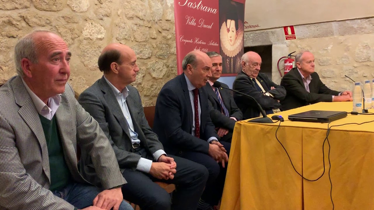 Sobre la tarima se encontraba, además de los dos protagonistas, tres de los alcaldes de Pastrana con los que ha trabajado Herguedas (Jesús Jabonero, Juan Pablo Sánchez e Ignacio Ranera), así como el presidente de la Diputación de Guadalajara, José Manuel Latre.