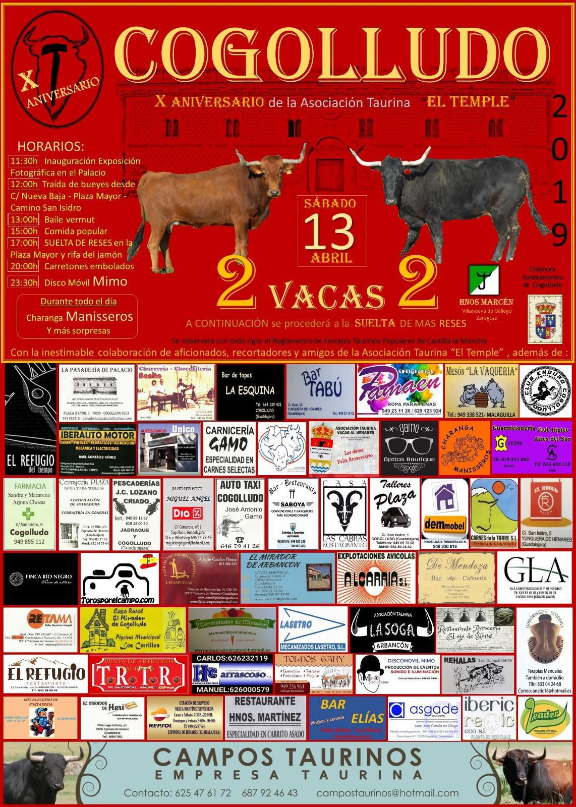 El próximo sábado 13 de Abril, en la Plaza Mayor de Cogolludo, tendrá lugar la Suelta de 2 Espectaculares Vacas 2, de la Prestigiosa Ganadería de Hnos. Marcén, de Villanueva de Gallego (Zaragoza) con motivo de la celebración del X Aniversario de la Asociación Taurina "El Temple" de Cogolludo.
