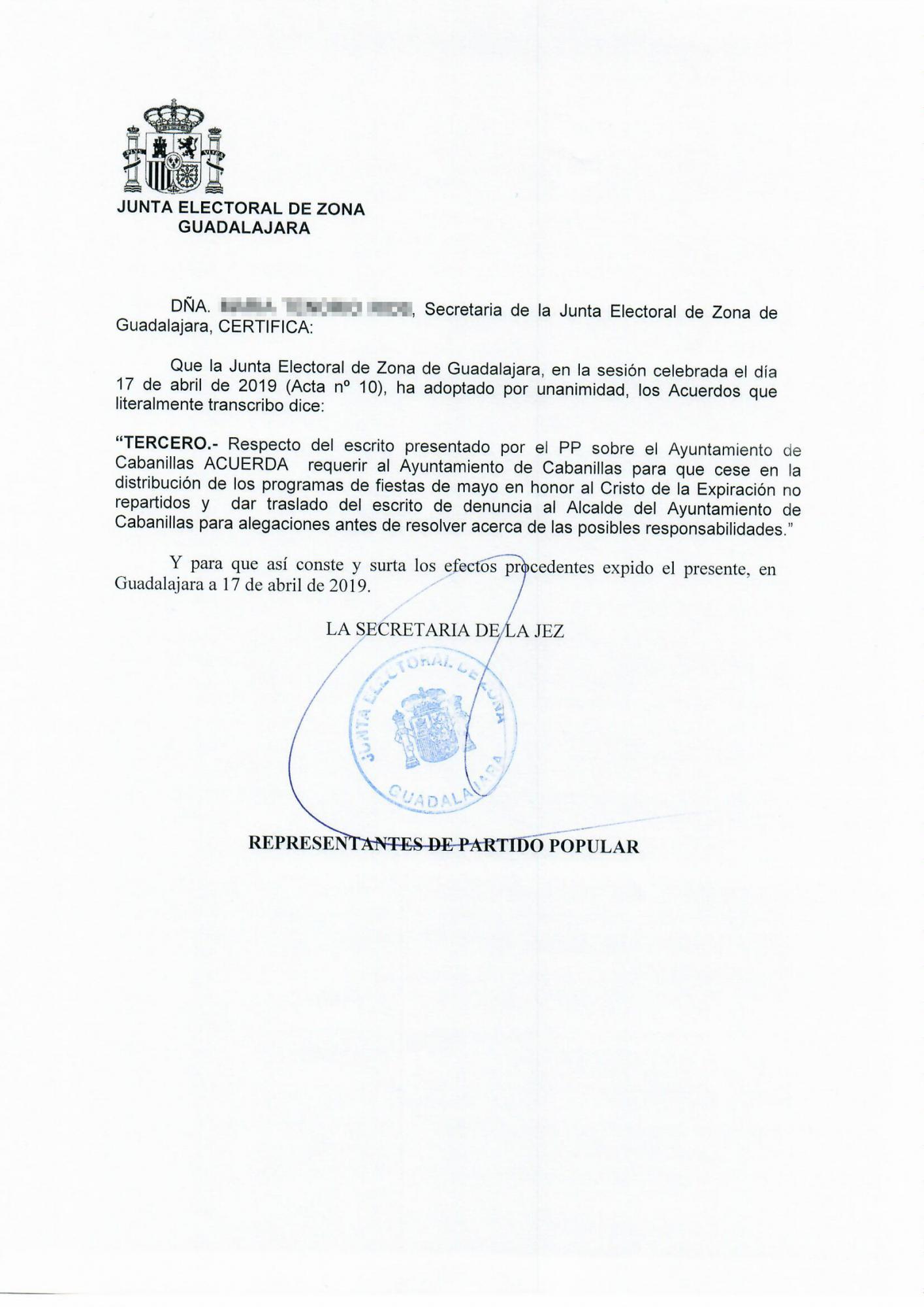 La Junta Electoral de Zona de Guadalajara ha obligado al alcalde de Cabanillas del Campo, el socialista José García Salinas, a cesar la distribución de los programas de fiestas de mayo en honor al Cristo de la Expiración. La decisión fue tomada “por unanimidad” tras la denuncia presentada por el Partido Popular.