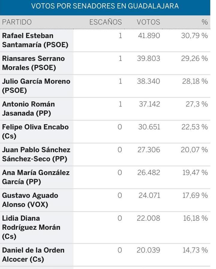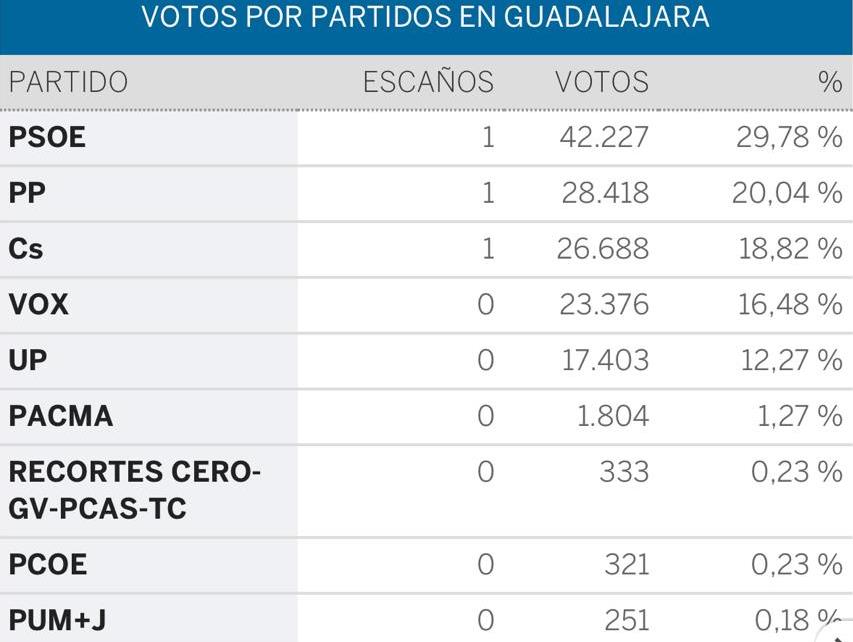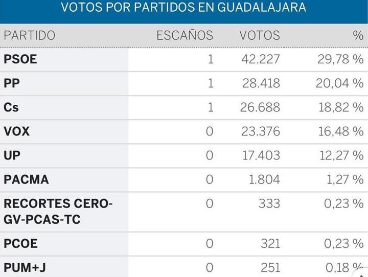 En Guadalajara, con el 100% de los votos escrutados, el PSOE mantiene el escaño logrado en los últimos comicios generales de 2016, mientras que el PP pierde uno de los dos escaños logrados en esa cita electoral y se queda con uno, mientras que Ciudadanos se apropia de ese escaño, consiguiendo así una representación que no tuvo en las pasadas generales.