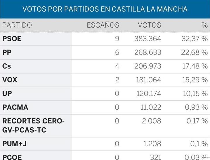 Con estos resultados, el PP ha logrado seis diputados -por los doce que tuvo en 2016-, Ciudadanos se ha convertido en la tercera fuera más votada, y ha obtenido cuatro escaños y Vox irrumpe en la política castellano-manchega como cuarto partido y más del 15 por ciento de los votos, que le han valido dos diputados.