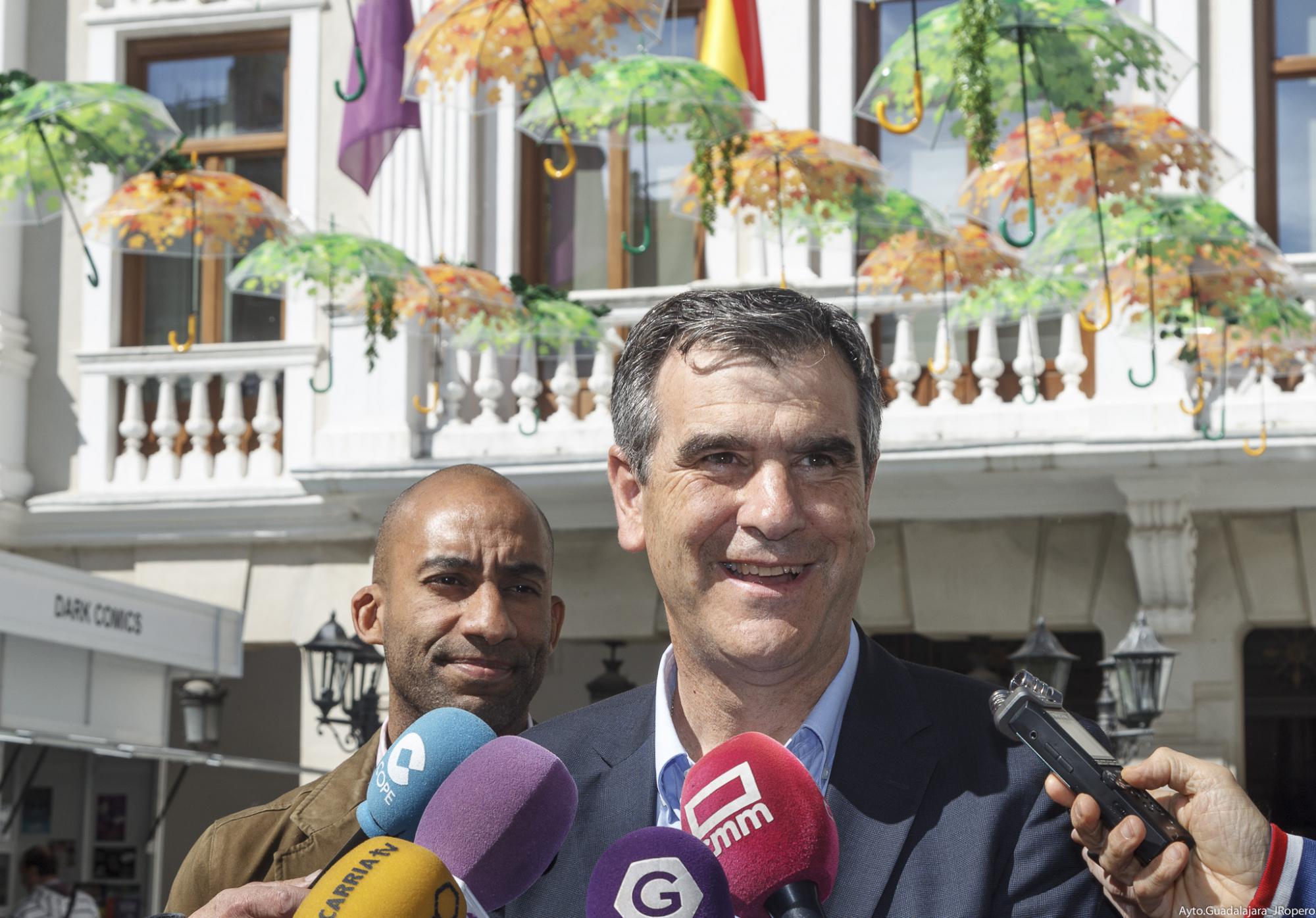 El alcalde de Guadalajara, Antonio Román, acompañado del teniente de alcalde, Armengol Engonga, ha presentado hoy una nueva edición de la Feria del Libro, que se celebrará en la Plaza Mayor hasta el domingo, 12 de mayo. La plaza ha sido decorada para la ocasión con decenas de paraguas con motivos vegetales.