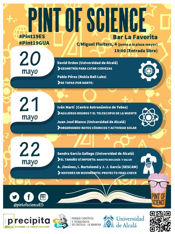 Pint of Science tampoco sería posible sin el apoyo de instituciones como la Universidad de Alcalá o el Parque Científico y Tecnológico de Castilla La Mancha que, en Guadalajara, ayudan a la organización del mismo. De hecho, varios de los investigadores que participan en esta edición de Pint of Science (Juan José Blanco, Sandra García, Juan Jesús García e Irene Bartolomé) desarrollan en Guadalajara proyectos de investigación conjunta entre la Universidad de Alcalá y el Parque Científico y Tecnológico. Y, por supuesto, no sería posible sin el apoyo desinteresado de los bares que, como es el caso de La Favorita en Guadalajara, no solo nos ceden su espacio e instalaciones, sino que nos asesoran con la organización y comparten nuestra pasión por el festival.