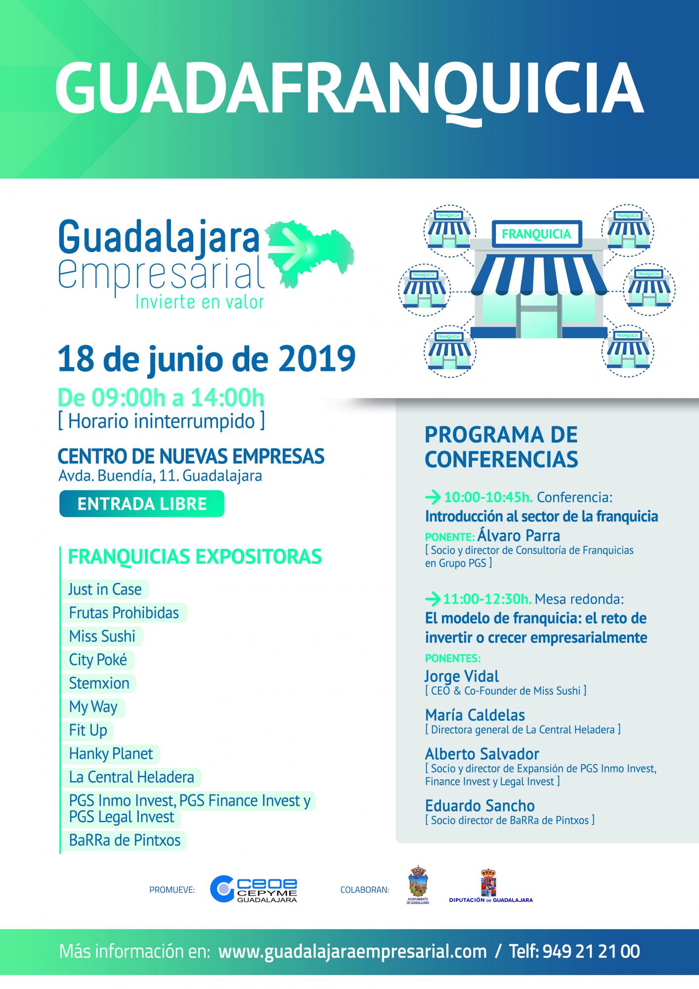 El próximo 18 de junio, el Centro de Nuevas Empresas de Guadalajara (CEEI Guadalajara) acogerá la primera feria de las franquicias. Todo aquel autónomo, empresario o particular interesado en iniciarse o profundizar sobre el sector de la franquicia en España podrá hacerlo en horario ininterrumpido, de 9 a 14 horas, en la Avenida Buendía 11, con entrada libre y gratuita.