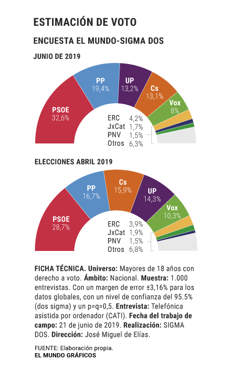 El gran favorecido por esta incertidumbre es, sobre el papel, el PSOE, que dispara su intención de voto en 3,9 puntos con respecto a abril, desde el 28,7% hasta el 32,6%.