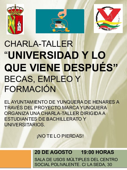El próximo 20 de agosto, a partir de las 19.00 horas, tendrá lugar en Yunquera de Heanares una charla-taller bajo el título “Universidad y lo que viene después. Becas, empleo y formación”.