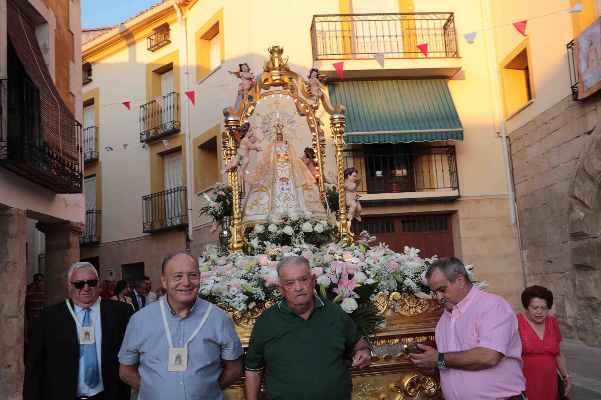 Fueron muchos fieles, de todas las edades, los que arrimaron el hombro para que la patrona de Almonacid paseara por las calles de la villa, en su carroza. El silencio, solemne, era solo interrumpido por el estallido de los cohetes, que se elevaban hasta lo alto de La Alcarria lanzados por Manuel Toledano desde diferentes puntos del recorrido, y por los vítores sucesivos a la patrona de Almonacid que les salían del alma a los almorcileños. De nuevo la Banda de Música de Pastrana, engalanaba el recorrido con su excelente repertorio de marchas procesionales. De vuelta en la Ermita, los fieles introducían la carroza de la Señora en su morada habitual.