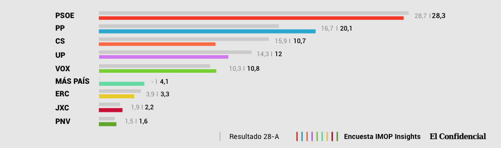 Son los datos del primer sondeo de IMOP Insights para El Confidencial de cara a las generales del 10-N. Una encuesta realizada entre el 1 y el 3 de octubre, a partir de 1.227 entrevistas. El estudio capta por tanto la irrupción de Más País, aunque la formación del exportavoz morado no ha concretado todavía en qué circunscripciones competirá, incógnita que forzosamente se despejará este lunes, cuando vence el plazo concedido a todos los partidos y coaliciones para registrar sus listas ante las juntas electorales. Que no se conozca por tanto aún por qué distritos competirá Errejón hace muy complicado estimar el reparto de asientos en el nuevo Congreso.