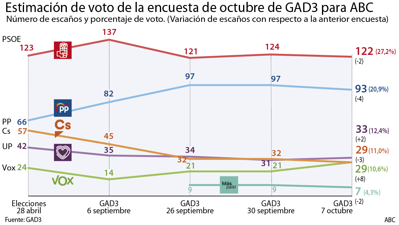 La caída de Ciudadanos está marcando el ritmo de la campaña electoral, hasta el punto de poder cambiar el tablero político en España. Según la última encuesta de ABC/GAD3, el partido de Albert Rivera sigue perdiendo votos y se situaría ahora con 29 escaños, los mismos que Vox. El principal beneficiado de esa fuga de electores es el Partido Popular, que se consolida por encima de los 90 escaños, frente a un PSOE que se estanca y continúa muy lejos de las expectativas que tenía de mejorar con claridad los resultados de abril.