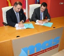 La firma del convenio entre Jaime Carnicero, presidente de la MAS, y Juan Carlos Lechón, director de la oficina de Caja3 en Guadalajara, en representación de la Obra Social de Caja Inmaculada, ha tenido como emplazamiento la sede de la Mancomunidad de Aguas del Sorbe.