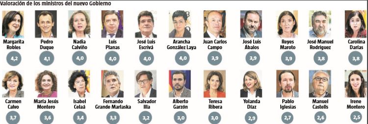 Ninguno de los nuevos ministros supera el aprobado, si bien los peor valorados son Pablo Iglesias, Irene Montero y Manuel Castells, el nuevo responsable de Universidades y al que se sitúa en el Gobierno dentro de la cuota de la Alcaldesa de Barcelona, Ada Colau. De la representación de Unidas Podemos en el Gobierno, el que tiene mejor nota es Alberto Garzón, coordinador de IU y ministro de Consumo, mientras que la delegación morada se queda abajo del todo en la escala de puntuaciones.