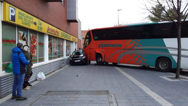 Un autobús que transportaba a 40 escolares ha colisionado este miércoles contra un turismo que estaba estacionado en Azuqueca de Henares (Guadalajara), al que ha empotrado contra un supermercado, sin que se hayan producido heridos, porque todos los pasajeros llevaban puesto el cinturón de seguridad.