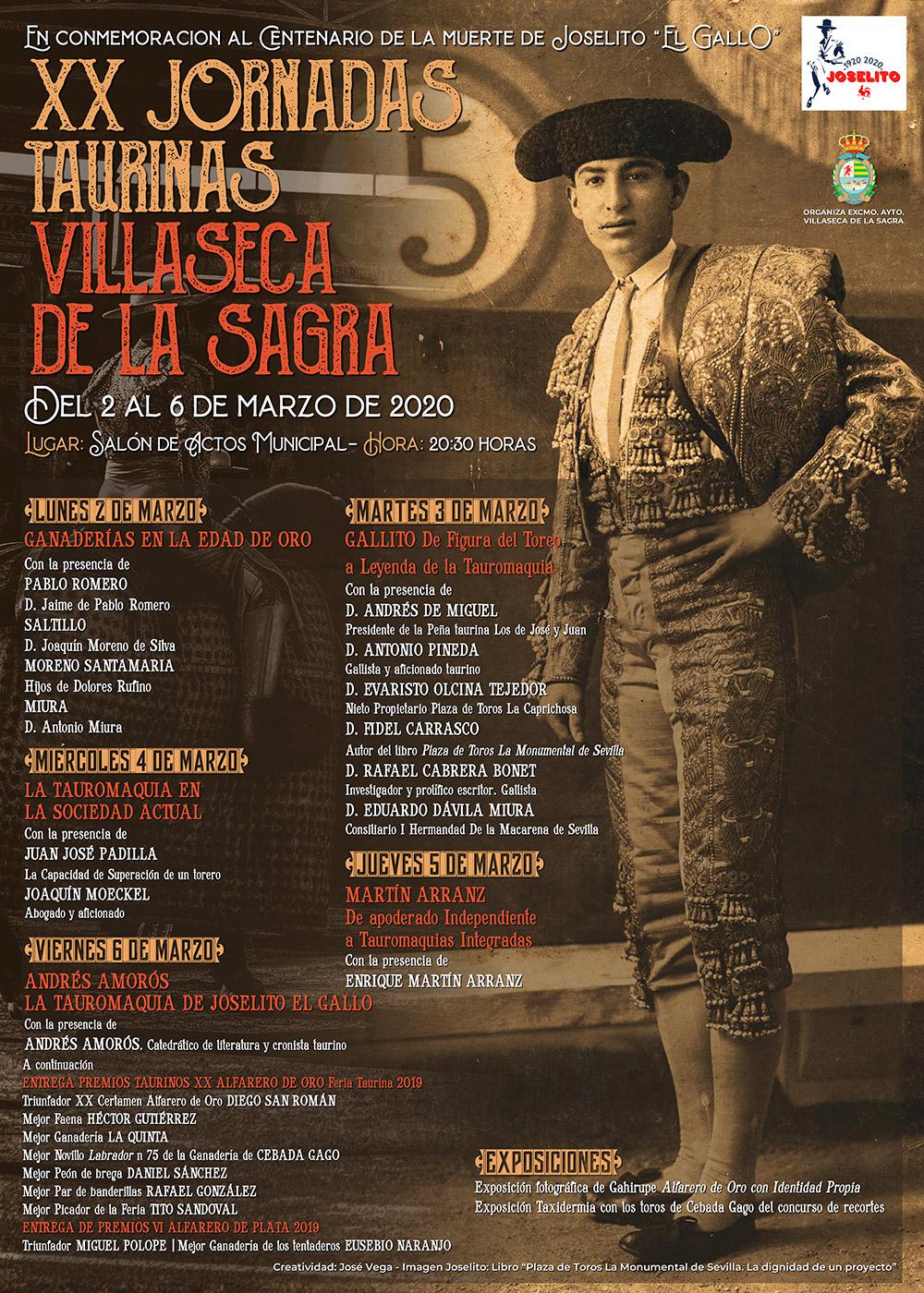 Villaseca de la Sagra con la celebración de sus “XX JORNADAS TAURINAS 2020” cumplirá dos décadas en la organización de su tradicional ciclo cultural-taurino que se celebrará durante la semana del lunes 2 marzo al viernes 6 de marzo de 2020 con un acento gallista en Conmemoración al Centenario de la Muerte de Joselito “El Gallo” donde una vez más el Ayuntamiento de Villaseca de la Sagra con el objetivo de relanzar la afición taurina así como de crear un foro de debate en torno a la Fiesta de los toros ha programado su ya tradicional ciclo cultural-taurino.
