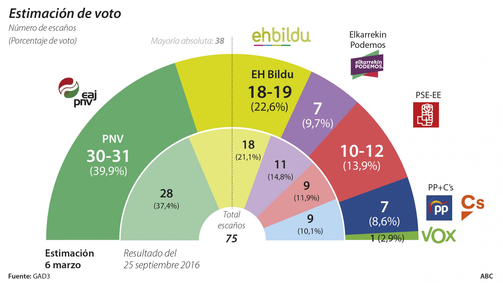En el Parlamento vasco, la mayoría absoluta se sitúa en 38 escaños, de un total de 75. El partido de Andoni Ortuzar e Íñigo Urkullu necesitaría pactar para seguir en el poder, y podría elegir entre el PSE y Bildu.