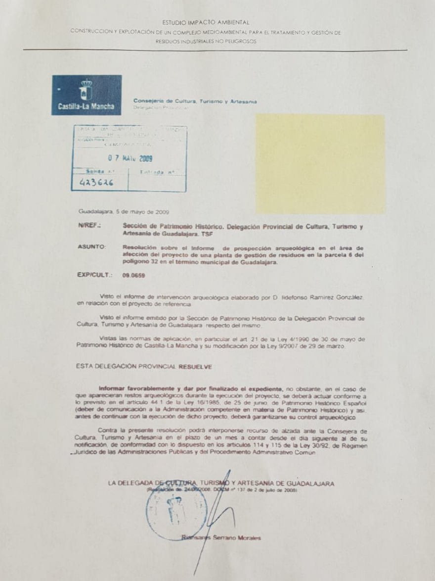 “Puedo afirmar también que la señora Riansares Serrano –actual concejala delegada de Cultura- también ha estado implicada en el proyecto como delegada de Cultura, Artesanía y Turismo que en fecha 7 de mayo del 2009 firma el informe de prospección arqueológica en el área de afección del proyecto de la planta de gestión de residuos en el polígono 32 en término municipal de Guadalajara”. “¿Tampoco lo conocía la señora Riansares Serrano que emite un informe arqueológico favorable?”, se ha preguntado Antonio Román.