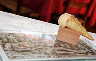 | Restaurante La Granja de Alcuneza, quiere sorprender al público con su “Corneto con helado de oro verde”, Nótese el paralelismo del Dondel con el corneto. De lujo. |