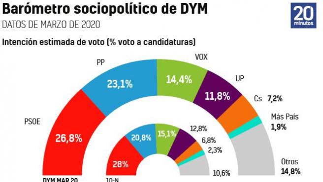 La crisis del coronavirus tiene un claro efecto político. Casi cinco meses después de las elecciones, PSOE y Podemos están afrontando el momento más delicado para la coalición, y la pandemia les está pasando factura. Esa es la principal conclusión de la encuesta de DYM para 20minutos.
