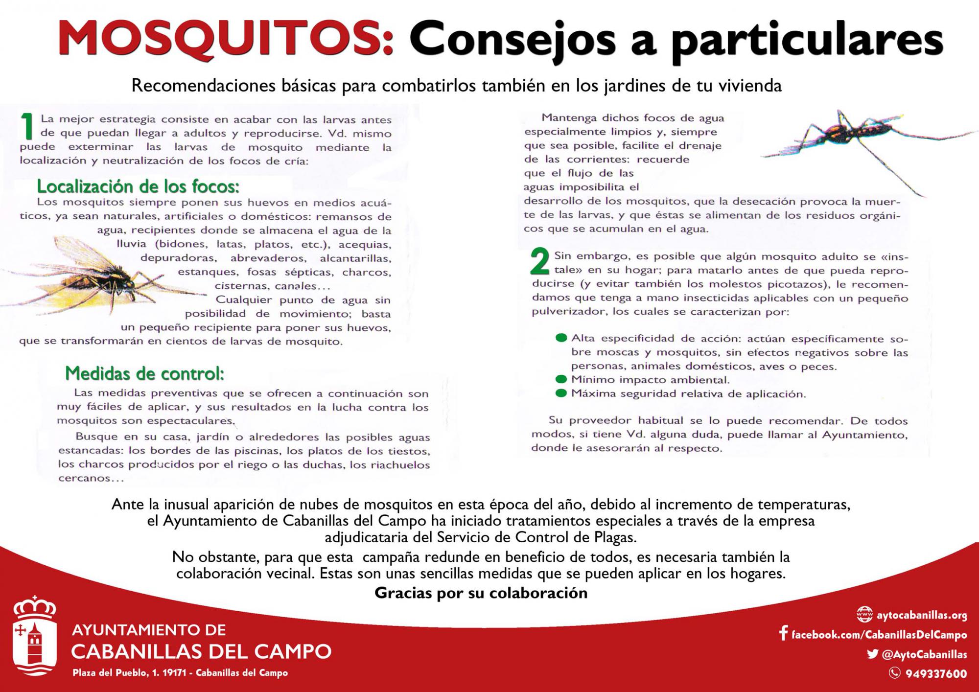 Debido a la súbita aparición de nubes de mosquitos en algunas zonas del núcleo urbano de Cabanillas, la pasada semana se realizó un tratamiento fitosanitario especial, dirigido a reducir la presencia de estos insectos, que se suma a las labores ordinarias que realiza para el Ayuntamiento la empresa adjudicataria del control de plagas, Ambión. Durante este tratamiento extraordinario se tomaron las oportunas precauciones para evitar tanto posibles molestias para los vecinos como el impacto sobre otras especies animales, dado que se usan los productos menos perjudiciales para aquellos insectos considerados "no diana", como pueden ser las mariquitas, saltamontes o abejas.