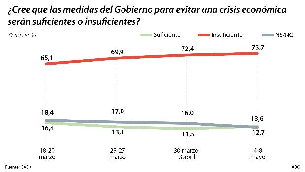 Según se recoge en el último barómetro de ABC/GAD3, tres de cada cuatro ciudadanos siguen viendo insuficientes las actuaciones del Ejecutivo para evitar un hundimiento económico, un aviso que ya lanzaron hace un mes.