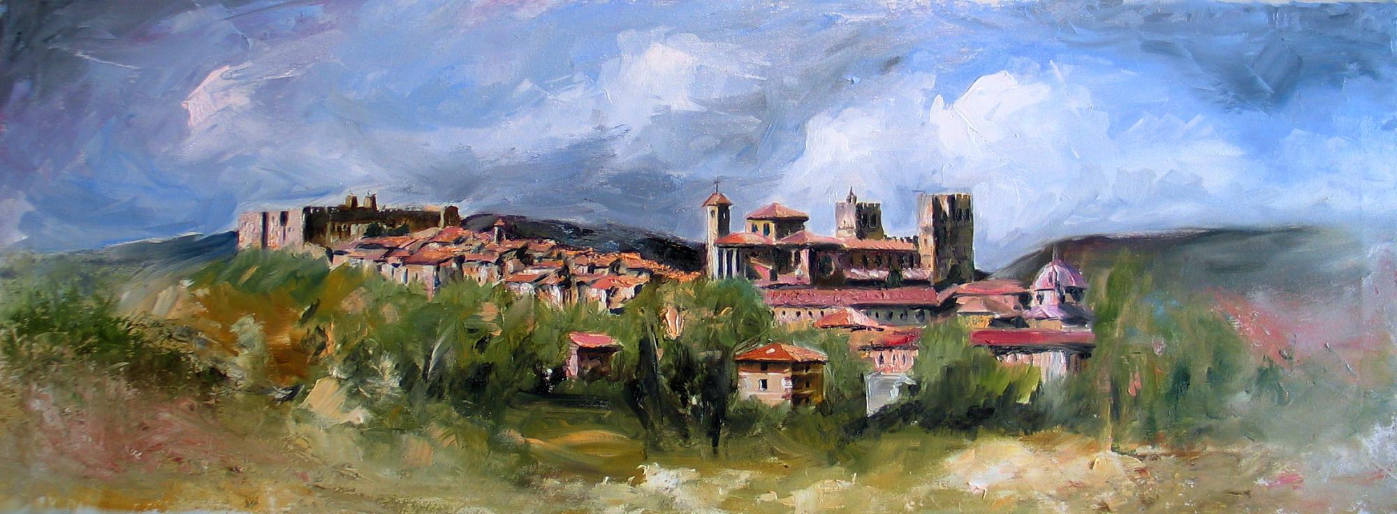 Con mi paleta, los pinceles y mis óleos, llego a Sigüenza como el viajero que arriba por primera vez. Y vuelvo a pararme, perplejo, estático, y claudico con los ocres, los azules cerúleos de sus cielos rotos por los grises plomizos de tormentas cargadas de cobalto. Las fachadas señoriales están teñidas de un carmín rosado y el verde pardo del pinar se entreteje en la ladera con los viejos amarillos napolitanos de cebadas trasnochadas. Y tantas tejas de vino viejo, con habitantes de musgo que las resucitan del horno en las que se fabricaron. Y la piedra. Tierra sombra natural, de siena tostada, mimosa y desgastada. Tierra/piedra hecha fortis por generaciones anónimas y prohombres entregados. Omnes fortes fuerunt.