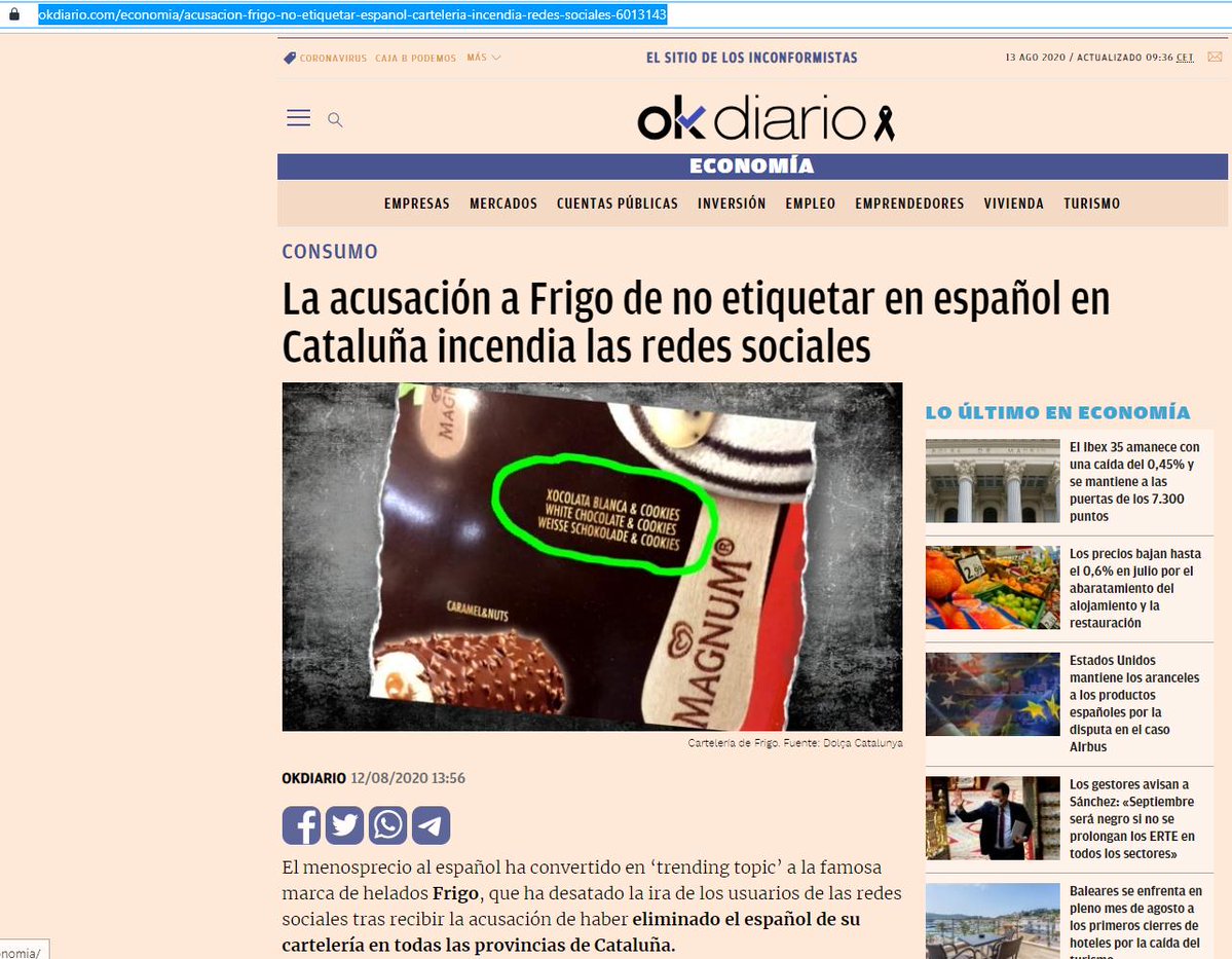 Frigo (Unilever España) elimina el IDIOMA ESPAÑOL de sus carteles de helados en Cataluña