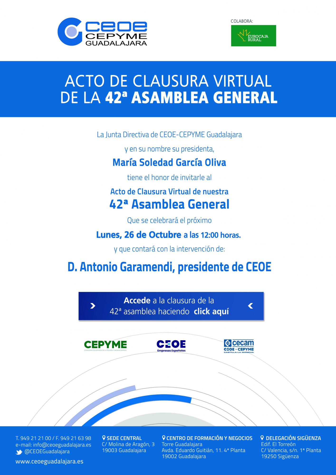 Posteriormente, a partir de las 12:00 horas, tendrá lugar el acto de clausura de la 42 asamblea general de CEOE-CEPYME Guadalajara, en formato virtual, y que contará con la intervención del presidente de Eurocaja Rural, Javier López y se clausurará cola intervención de Antonio Garamendi, presidente de CEOE Nacional.