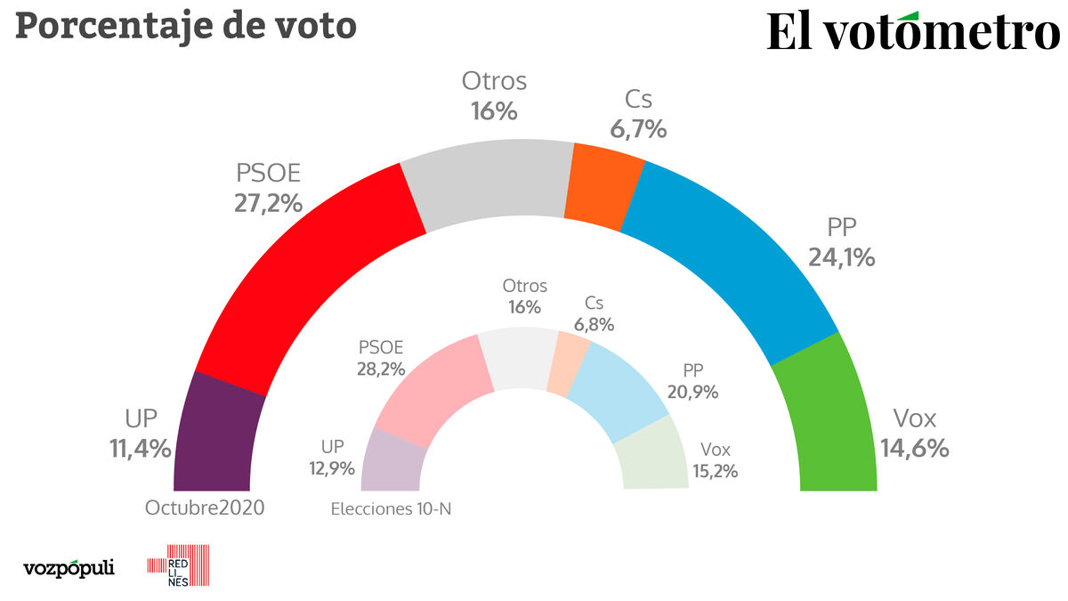 Así lo refleja el primer Votómetro, una herramienta de proyección de resultados electorales que ponen en marcha Vozpópuli y Redlines, empresa dirigida por el consultor político César Calderón. El sistema utilizado para este estudio consiste en una media ponderada de los resultados de las doce empresas demoscópicas que mejores datos han obtenido en el último año en España. Los datos recogidos van desde julio hasta octubre de 2020.