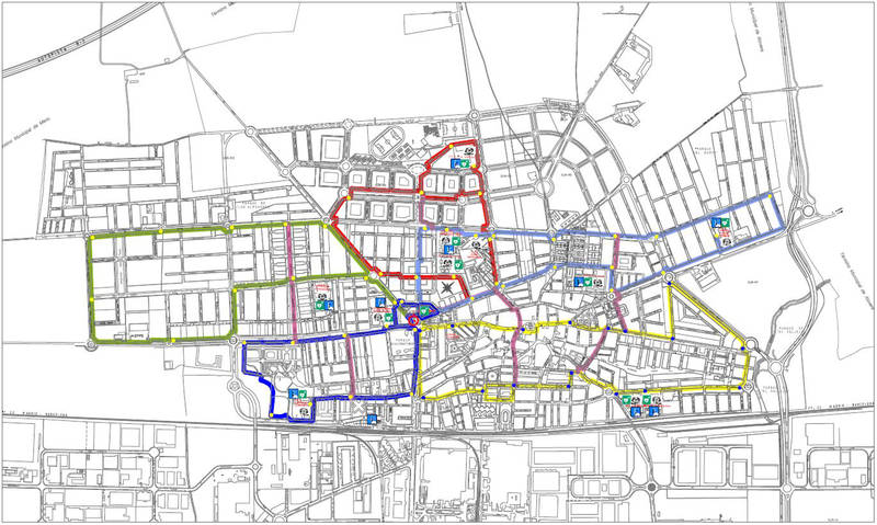 El proyecto contempla la creación de cinco rutas circulares y con salida desde la plaza de La Constitución, frente al Ayuntamiento, donde se colocará una señal informativa. Todas se apoyan en aceras, carril bici o zonas ciclables existentes y van a incluir recorridos alternativos señalizados para reducir la distancia de la ruta en función del destino. La ruta 1 tiene una longitud de 3.200 metros y enlaza con los CEIP La Espiga y Siglo XXI, mientras que la ruta 2, de 4.200 metros, permite llegar a los CEIP La Paz y Maestra Plácida Herranz, el CEPA Clara Campoamor y al IES Profesor Domínguez Ortiz. La ruta 3 abarca 4.300 metros y pasa por los IES San Isidro y Arcipreste de Hita. La ruta 4, con 2.800 metros, llega al CEIP Virgen de la Soledad y al centro concertado Giovanni Antonio Farina y, por último, la ruta 5, une con el CEIP La Paloma y cubre una distancia de 3.900 metros.