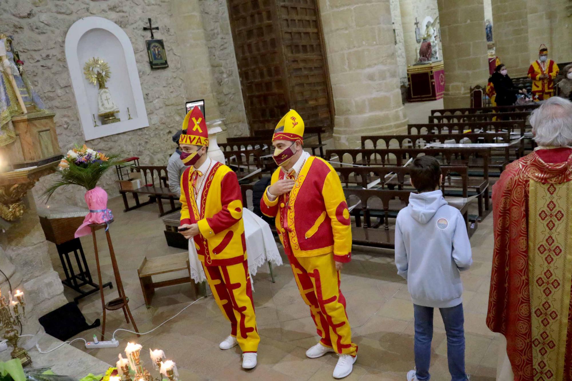 Ese mismo sentimiento contenido podía verse en la mirada que cada albalateño le dirigía a la imagen de su patrón, en el altar de la iglesia. Engalanado de flores, a sus pies no faltaba detalle. Allí estaban las cachiporras de olivo, que no han aporreado este año las puertas; los castañuelones, que se han quedado mudos; las caridades o bollos típicos de este día, que tampoco se han podido elaborar este año como es costumbre; y los trajes de botarga…