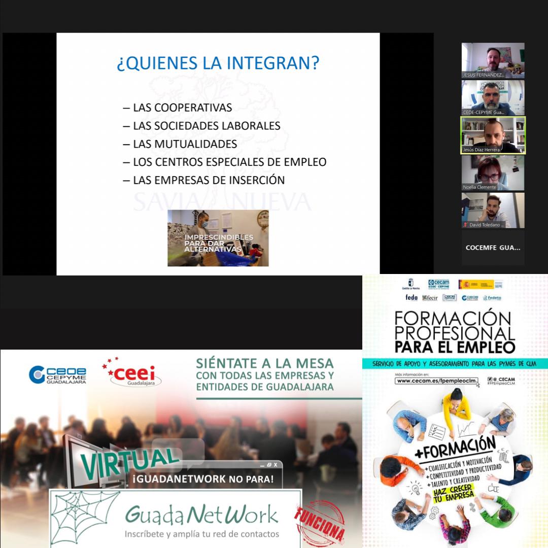 GuadaNetWork ha desarrollarlo un nuevo encuentro virtual donde la FP para el empleo y la economía social fueron los protagonistas, dentro de este proyecto creado conjuntamente entre CEOE-CEPYME Guadalajara y el CEEI alcarreño, con la colaboración de la Diputación Provincial de Guadalajara y la Junta de Comunidades de Castilla-La Mancha.