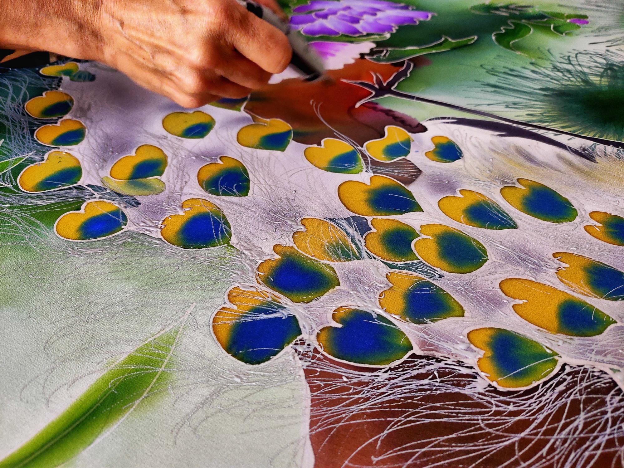 “Lo que hago en mi taller es comprar la seda natural blanca, la tenso en un lienzo y le aplico diferentes técnicas para pintarla a mano. Luego las convierto en cuadros, piezas de vestir o complementos. Y esa es la magia, que creas algo atemporal, un fondo de armario exclusivo para toda la vida”.