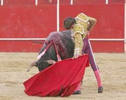 Nuevamente de hinojos esperó junto a las tablas al sexto para torear a la verónica con mucho oficio. El manso peligroso que tenía enfrente no fue obstáculo para que se pusiera de verdad. Incluso se llevó una fea voltereta de la que se levantó para ponerse de nuevo con valentía. Firme candidato a triunfador del ciclo.