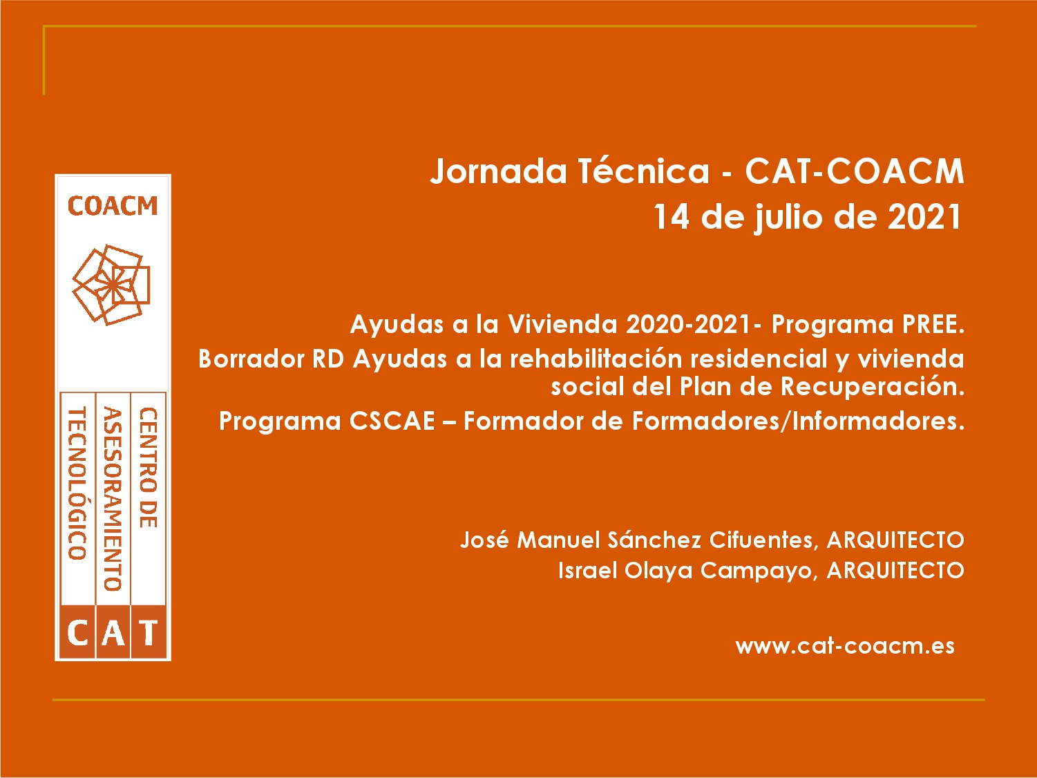 Toledo. 16 de julio de 2021. Este miércoles, 14 de julio, tenía lugar, de manera virtual, la tercera jornada formativa en materia de ayudas a la rehabilitación, que se vienen celebrando desde finales de 2020, organizada por el Colegio Oficial de Arquitectos de Castilla-La Mancha, desde su Centro de Asesoramiento Tecnológico (CAT).
