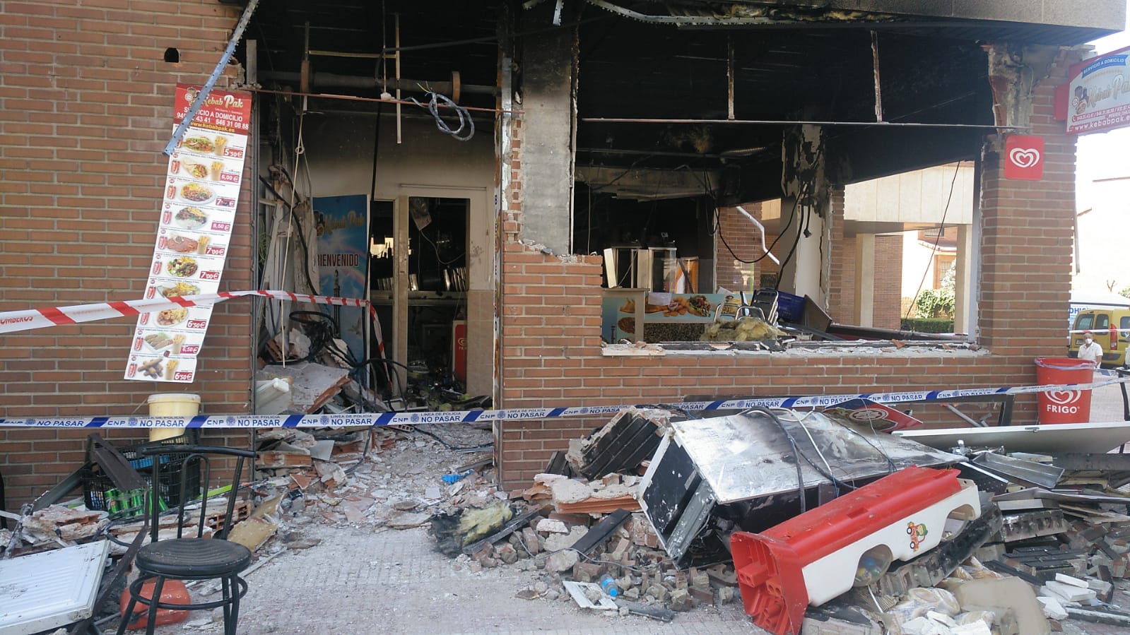 Los bomberos han extinguido el incendio del local, posterior a la deflagración por gas, y después los servicios municipales de limpieza han la zona de restos de la explosión.