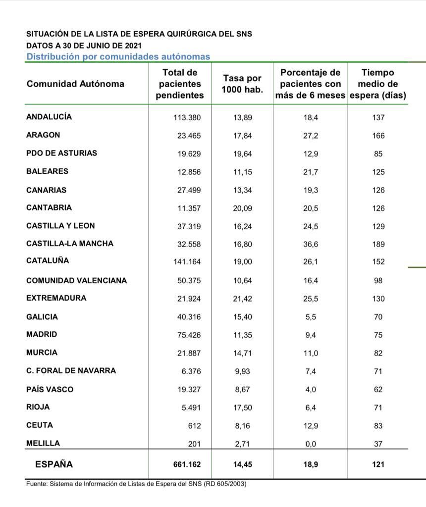 Según el informe publicado el día 16 de noviembre por la Secretaría General de Información sobre las Listas de Espera en el Sistema Nacional de Salud (SISLE-SNS) Castilla-La Mancha se ha convertido en la región con peor servicio sanitario de toda España. Castilla La Mancha es, a fecha 30 de junio de 2021, la región en la que más días de media tiene que esperar un paciente para una intervención quirúrgica. Concretamente, 189 días. Es, igualmente, la región con el mayor porcentaje de todo el país en volumen de pacientes que llevan esperando una operación más de 6 meses. En concreto el 36,6%. Tiene los peores datos en 11 de las 14 especialidades quirúrgicas que analiza el informe.