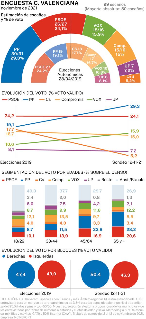 Sin embargo, las esperanzas que han residenciado en la Comunidad Valenciana podrían ser infundadas, si tenemos en cuenta la última encuesta de NC Report para LA RAZÓN, que devolvería al PP a la primera fuerza. Si hoy hubiera elecciones, los populares adelantarían al PSOE como el partido más votado gracias a la absorción del grueso del cuerpo electoral de Ciudadanos y relanzarían al bloque de la derecha hasta un empate técnico con el de la izquierda. En concreto, el PP obtendría el 29,3% de los votos y entre 30 y 31 escaños, lo que le permitiría arrebatar la Generalitat a Ximo Puig.