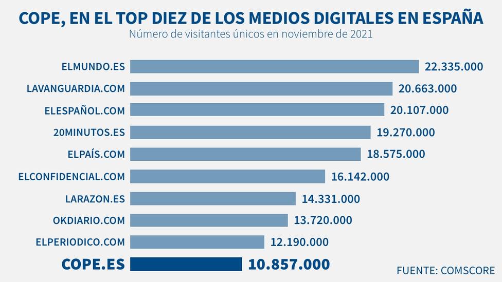 Según Comscore, medidor de referencia del mercado digital, 10.857.000 visitantes únicos entraron en COPE.es durante el mes de noviembre de 2021. Este dato supone un 0,67% más de audiencia en que en octubre y uno de sus mejores resultados históricos. COPE se mantiene así en el líder indiscutible de la radio digital en España, superando ampliamente a toda su competencia. CADENASER.com se queda en 9.247.000 visitantes únicos, un 14,26% menos que COPE; y OndaCero.es en 4.029.000, casi tres veces menos. En el sector de los medios digitales generalistas, COPE.es también escala posiciones y entra en el top10 de los más leídos en nuestro país. Con sus casi 11 millones de visitantes únicos supera a diarios de gran seguimiento como eldiario.es, huffingtonpost.es o todas las webs de cadenas de televisión nacionales.