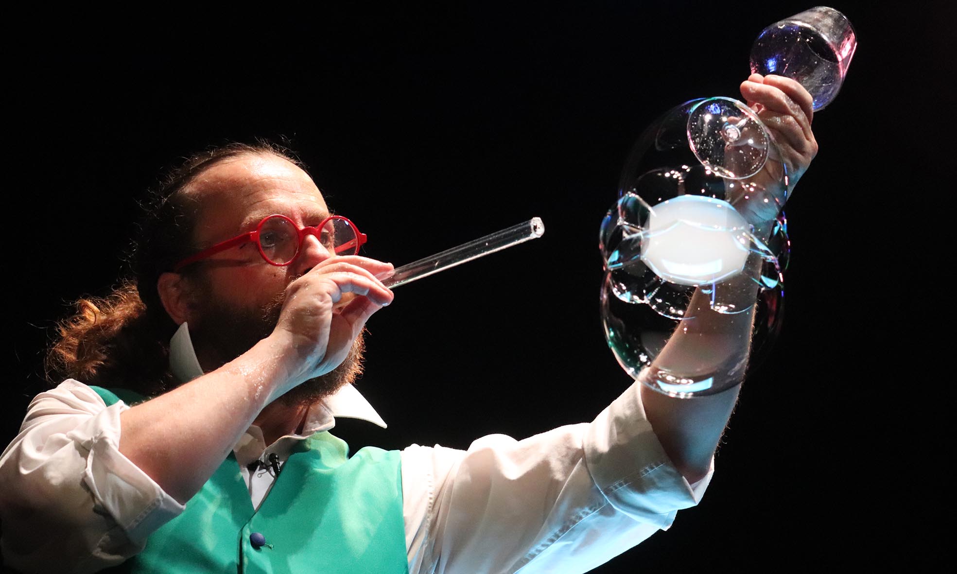 Los dos artistas sobre el escenario, Esther e Israel Muñoz, atrapan al público desde el primer minuto, y captan una atención constante durante más de una hora, a base de una frenética sucesión de trucos y creaciones con las pompas de jabón. Se usan pompas grandes y pequeñas; transparentes y de colores; redondas y con formas caprichosas; con humo y juegos de gas y fuego… y sobre todo, con muchísima interacción con el público, ya que no paran de sacar voluntarios al escenario, a los que hacen partícipes del espectáculo.