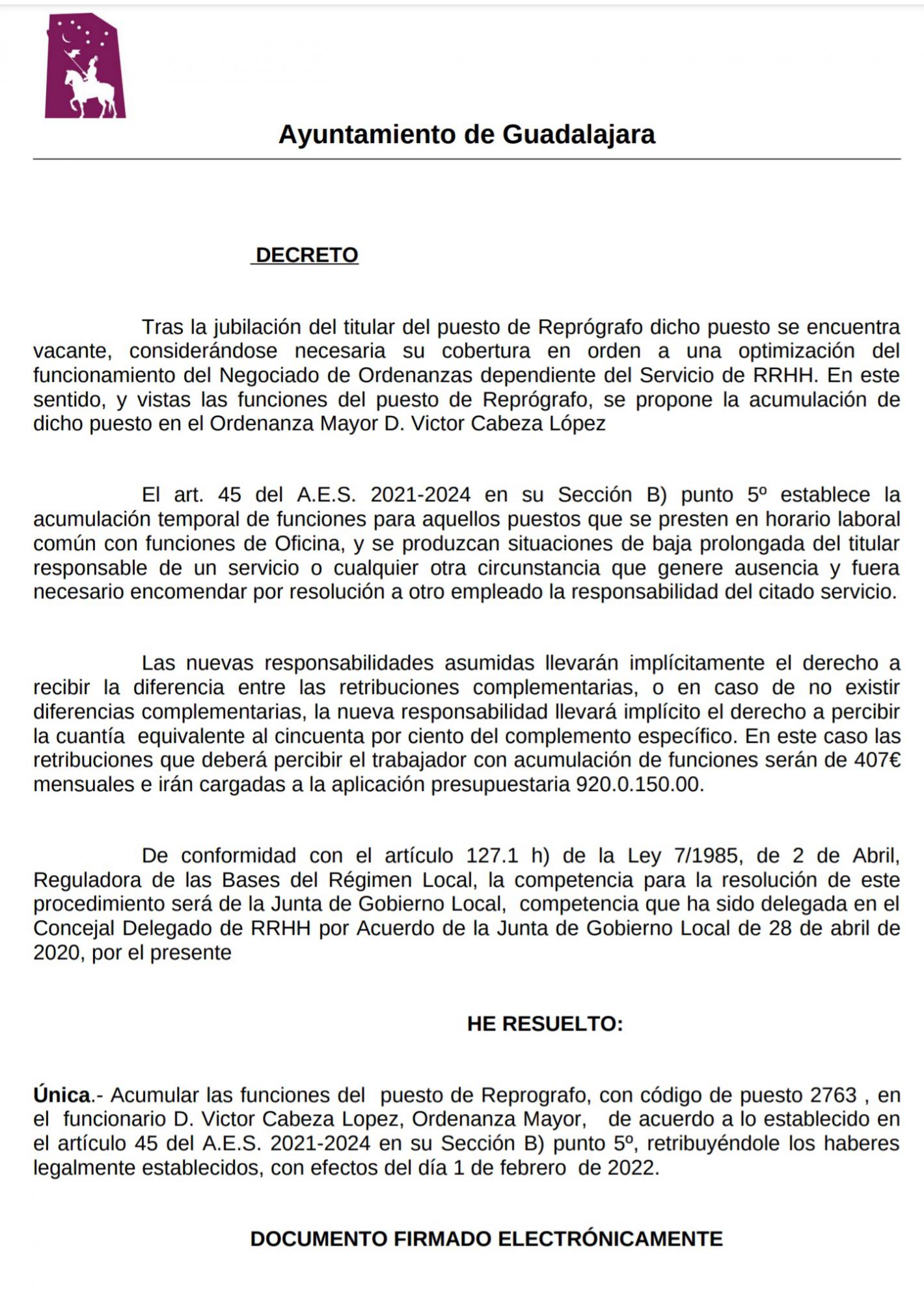 “Por esta nueva ocupación, dada a dedo, puesto que se podía haber convocado para todos los funcionarios de este Ayuntamiento o como promoción interna para los mismos ordenanzas, va a ver incrementado su sueldo en 5.698 euros al año por hacer fotocopias”.